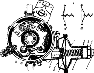 Вакуумный регулятор (рис. 7) служит для изменения угла опережения зажигания в зависимости от нагрузки двигателя. Вакуумный регулятор обеспечивает также снижение расхода топлива, особенно при работе двигателя на малых и средних нагрузках. Вакуумный регулятор работает независимо от центробежного регулятора.
