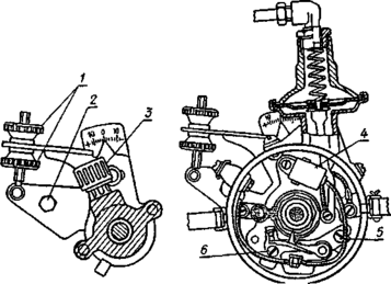 1 — гайки октан-корректора; 2 — винт крепления распределителя к корпусу привода; 3 — колпачковая масленка; 4 — конденсатор; 5 — регулировочный эксцентриковый винт; 6 — стопорный винт