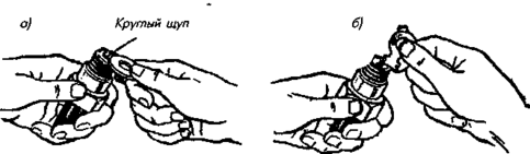 Регулируют зазор подгибанием бокового электрода, а его величину проверяют щупом (рис. 12). Центральный электрод подгибать нельзя, так как разрушается керамическая изоляция и свеча зажигания отказывает в работе.