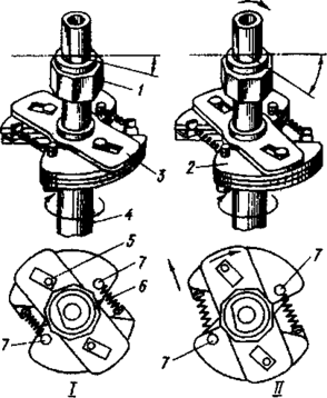 1 — кулачок; 2 — грузик; 3 — пластина кулачка; 4 — ведущий валик; 5 — штифт; 6 — пружина; 7 — ось грузика.