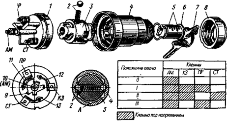 Ротор выключателя может занимать три положения. В первом положении (ключ повернут вправо) включены зажигание, радиоприемник и приборы. При дальнейшем повороте ключа вправо (второе положение) включаются зажигание, стартер, контрольно-измерительные приборы. В этом положении ключ необходимо удерживать рукой. Третье положение (поворот ключа влево) соответствует включению радиоприемника, магнитофона на стоянке.