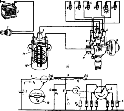 Батарейная система зажигания состоит (рис. 14) из катушки зажигания 3, прерывателя-распределителя 5, искровых свечей 4 и выключателя зажигания 1. Система зажигания получает питание от аккумуляторной батареи 2 или генератора.