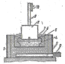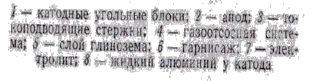 Электролизер состоит из основного корпуса 1, футерованного внутри угольными блоками; в его подовую часть с помощью шин 2 и 3 подведен отрицательный полюс источника тока. Над корпусом подвешен угольный анод 8, к которому с помощью шин 9 и 10 присоединен положительный полюс источника напряжения. Если в электролизер залить расплав, состоящий из криолита и глинозема, опустить в этот расплав анод и пропускать через расплав постоянный ток большой силы и необходимого напряжения, то через определенное время на дне электролизера можно обнаружить расплавленный алюминий 4 под слоем расплавленного электролита 6, состоящего из криолита Na3AlF6, в котором при температуре, близкой к 1000 С, обычно растворено от 1 до 10% глинозема. Электролит поддерживается в расплавленном состоянии только за счет теплоты, выделяющейся при прохождении через него электрического тока, поэтому часть электролита всегда застывает на холодных стенках и образует твердую застывшую корку 5, на которую сверху насыпают порошкообразную окись алюминия 7.