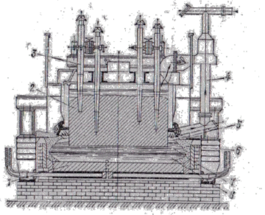 настоящее время наиболее широко применяют электролизеры, рассчитанные на силу тока, превышающую 100 кА, с заранее обожженными анодами или с верхним подводом тока к самообжигающимся анодам (см. рисунок ниже). Получение алюминия в таком электролизере осуществляется непрерывно в течение двух-трех лет; при этом выполняются следующие основные операции: наблюдение за составом электролита, обеспечение своевременной загрузки глинозема и извлечения алюминия, наблюдение за напряжением и обслуживание самообжигающейся анодной системы.Процесс электролиза сводится к разряду ионов А13+ и 02+, из которых состоит глинозем, который непрерывно расходуется. Криолит не подвергается непосредственному электролизу и расходуется мало, однако из-за его физических потерь (испарения, выплескивания и т.д.), а также взаимодействия его отдельных составляющих с примесями глинозема и футеровкой электролизера приходится систематически следить за его уровнем в ванне (толщина слоя 18-25 см) и химическим составом.