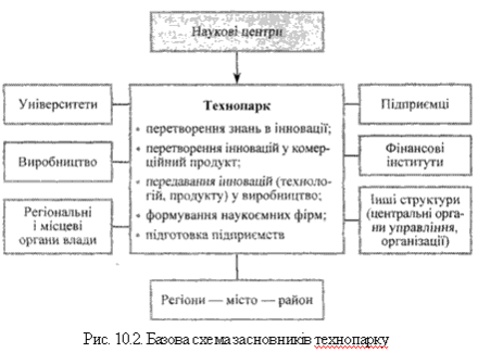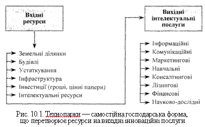 Технопарки показали свою ефективність щодо скорочення циклу наука — виробництво — споживання. В умовах науково-технічного парку потрібно 3—5 років на створення і просування на ринок нового продукту і ще близько 2—3 років, щоб повернути кошти, витрачені на його розробку. Територіальна близькість різнохарактерних за своїм профілем закладів (університети, приватні промислові підприємства, державні заклади), що входять до парку, позитивно впливає на діяльність кожного з них, сприяючи зближенню науки і виробництва, підвищуючи ефективність інвестицій. Фірми, які входять до складу технопарків, виділяють кошти на оснащення навчальних закладів, залучають до роботи у своїх лабораторіях студентів та випускників університетів (рис.10.1).