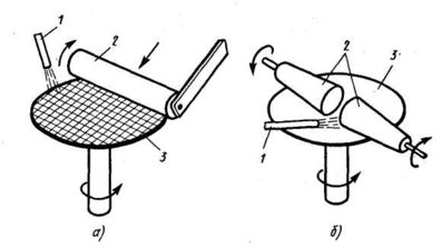 Рисунок 7.3.1. Схемы гидромеханической отмывки подложек цилиндрической (а) и конической (б) щетками:
