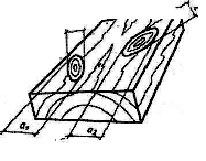 Не выходящие на ребро круглые, овальные, продолговатые и разветвленные сучки измеряют:по расстоянию между касательными к контуру сучка, проведенными параллельно продольной оси сортимента (размеры а1, а2 );