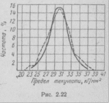 Из этого рисунка видно, что наиболее часто встречающимся значением предела текучести для этой стали является σт = 30 кГ/мм2 (15% всех случаев). Минимальное значение близко к 22 кГ/мм2 и максимальное — к 38 кГ/мм2. Вид кривой показывает, что не исключена возможность (при большем числе испытаний) обнаружения, с одной стороны, более низких и, с другой стороны, более высоких значений предела текучести.