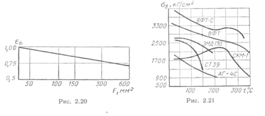 На рис. 2.20 приведены значения масштабного коэффициента εσ, при растяжении для стеклопластиков в зависимости от площади поперечного сечения образца;