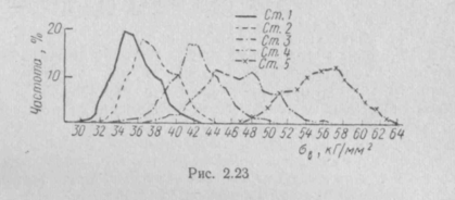 На рис. 2.23 приведены частотные диаграммы предела прочности для сталей Ст.1÷Ст.5, из которых видно, что сталь Ст.4 и сталь Ст.5 менее однородны, чем остальные стали.
