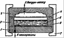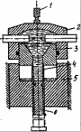 Рис.6. Схема штамповки, метанием передающей среды: 1 - матрица; 2 - заготовка; 3 - вода; 4 - заряд ВВ; 5 - предохранительная прокладка; 6 - замки