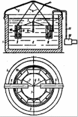 7. В небольшом стационарном бассейне 1, заполненном водой 2, подвешивается, круглый (в форме массивного кольца) матрицедержатель 3 при помощи каната 4 на стойке 5. Заряд ВВ 6 размещают в центре матрицедержателя при помощи центрирующего устройства 7. Матрицы 8, число которых применяют от трех до восьми, располагают симметрично в матрицедержателе. Каждая матрица имеет свое прижимное кольцо и заготовку. Удаление воздуха из матрицы осуществляется коллектором 10, гибким шлангом 11 и вакуумным насосом 12. Совмещение операций в одном бассейне встречается часто. Такое совмещение можно подучить, рассматривая жидкую передающую среду как универсальный пуансон, при помощи которого можно осуществить почти одновременно разные по виду операции. Рассмотрим схему штамповки, показанную на Рис.6: в рабочей полости 8 замкнутой системы деформирования устанавливается матрица, показанная на рис.5, б, под действием ударной волны прежде всего произойдет вытяжка (контур заготовки показан прерванной линией), потом резка ножом, находящимся на дне матрицы, и в конце - отбортовка. Когда в рабочей полости сооружения находится матрица (см. рис.5, в), последовательность формовки будет несколько иной - после движения заготовки нож, находящийся на обводе матрицы, отрубает заготовку и затем происходит вытяжка.