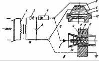 При этом возможен непосредственный пробой жидкости 6 или взрыв проводника 3. Последний случай наиболее часто применяется при развальцовке труб 7 в трубной доске 9 с использованием специальных патрончиков 10 (рис.8, б).