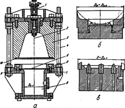 Принцип действия сооружения состоит в том, что внутренняя поверхность крышки 5 оформлена в вида параболического отражателя, в фокусе которого умещается заряд ВВ 2, который приводится в действие ударным устройством 1. Крышка-отражатель примыкает плотно к прижимному кольцу 6 и, так как по поверхности 10 крышки размещается уплотнение, пространство над заготовкой S заполняется водой. Заготовку 5 укладывают на вытяжное кольцо 7, а прижим к ним осуществляется прижимным кольцом 6, воздух с рабочей полости 8 удаляется. Уплотнение 9 гарантирует герметичность рабочей полости. Импульс заряда, действующий в верхней точке отражателя, принимается от шпилек 4. Рабочую полость можно использовать для свободной вытяжки только при помощи вытяжного кольца или для расположения матриц разного типа, две из которых показаны на рис.5, б, в.