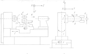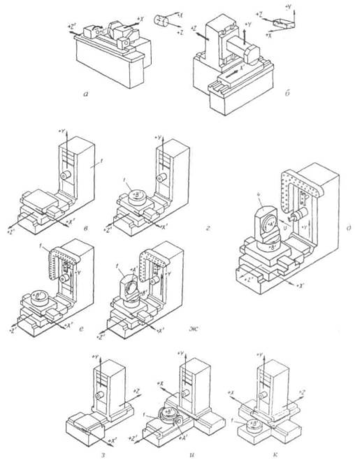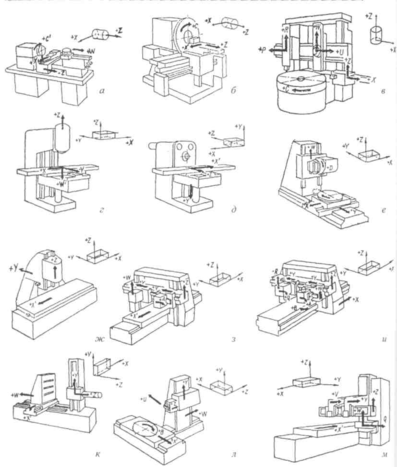 На рисунках 3–6 изображены схемы различного оборудования с ЧПУ, на которых указаны обозначения и положительные направления движений рабочих органов относительно стандартной системы координат, связанной с обрабатываемой заготовкой.