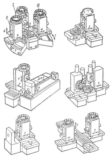 е – фрезерного с поворотным столом и поворотной бабкой; ж – вертикального портально-фрезерного; з – двухстоечного портально-фрезерного; и – двухстоечного с подвижным порталом; к – горизонтально-расточного с неподвижной передней бабкой; л- с продольно-подвижной передней бабкой; м – продольно-строгального