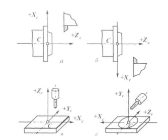 Системой координат токарного станка служит двухкоординатная система X, Z. Начало этой системы принимается в базовой точке шпиндельного узла. Положительные направления осей системы координат токарного станка определяются расположением основного рабочего диапазона перемещений инструмента (рис. 2, а, б).
