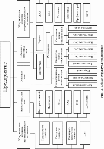 Соответственно рассмотренному выше содержанию производственного процесса как совокупности основных, вспомогательных и обслуживающих процессов производственного назначения на любом машиностроительном (радиоэлектронного приборостроения) заводе необходимо различать основные, вспомогательные и побочные цехи и обслуживающие хозяйства. Их состав, а также формы производственных связей между ними принято называть производственной структурой предприятия (рис. 1).