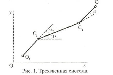 Рассмотрим сначала плоский трехзвенник О1С1С202 (Рис – 1), состоящий из центрального звена С1С2 длины 2а и двух звеньев О1С1 и С202 длины ℓ каждое. Многозвенник может двигаться по неподвижной шероховатой горизонтальной плоскости, в которой введена декартова система координат ху. Обозначим через х, у декартовы координаты середины корпуса, а через Θ1, Θ, Θ2 углы наклона звеньев О1С1, С1С2, С2О2 соответственно к оси х. Положим Θi = Θ + αi, где αi – углы между корпусом и концевыми звеньями ОiСi соответственно.