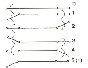 Состояние 5 тождественно состоянию 1. Описанный цикл из двух быстрых и двух медленных движений можно повторить любое число раз. Чтобы в конце движения перевести трехзвенник из состояния 5 в прямолинейное состояние 0, нужно выполнить медленное движение, изменив α1 от β до 0.