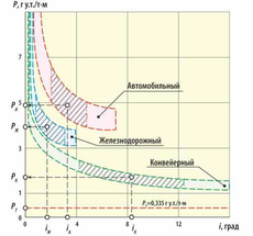– области фактических значений удельной энергоемкости различных видов транспорта глубоких железорудных карьеров.