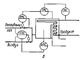 Сильным возмущением режима работы трубчатых печей со стороны топливного газа является изменение его давления. Это изменение компенсируют введением в АСР температуры продукта на выходе из печи дополнительного регулятора давления, задание на который подают от регулятора температуры в топочном пространстве. Такие системы обеспечивают качественное регулирование расхода топливного газа, так как расход газа в большой степени зависит от его давления (см. рис. VII-15,в).