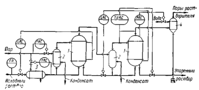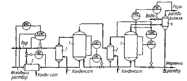 В этом случае греющий пар подают на установку в определенном соотношении с расходом исходного раствора, применяя регулятор соотношения, воздействующий на подачу пара. Это соотношение корректируют регулятором концентрации растворенного вещества в исходном растворе. Для стабилизации работы второго выпарного аппарата частично упаренный раствор, направляемый в него, регулируется по каскадной схеме регулирования расхода с корректировкой по уровню раствора в первом выпарном аппарате. Упаренный раствор отводят с установки по уровню в последнем аппарате, регулятором, задание, которому изменяет регулятор концентрации растворенного вещества в упаренном растворе. Давление в системе поддерживается на заданном значении посредством регулирования расхода паров растворителя с коррекцией по давлению в последнем выпарном аппарате.