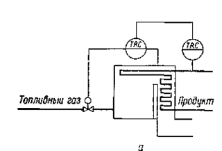 Цель регулирования трубчатых печей — поддержание постоянства температуры продукта на выходе из печи. Возмущениями объекта являются расход и температура исходного продукта, теплотворная способность топлива, количество и температура воздуха, подаваемого для сжигания топлива, потери тепла в окружающую среду и ряд других. Эти возмущения можно скомпенсировать с помощью АСР температуры продукта на выходе из печи, управляющей подачей топлива в печь. Однако трубчатые печи обладают запаздыванием по передаче тепла от дымовых газов через стенку змеевика к проходящему по нему продукту, кроме того, переходный процесс по каналу «расход топлива — температура продукта на выходе» продолжается несколько часов. Поэтому при использовании одноконтурной АСР динамическая ошибка и время регулирования достигают больших значений.