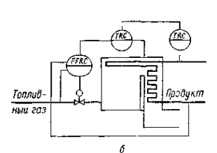 При резком изменении нагрузки печи по расходу нагреваемого продукта и при наличии возмущения по расходу топлива используют также вышеописанную систему каскадного регулирования, стабилизирующий регулятор которой воздействует на регулятор соотношения расходов продукта и топлива. В этом случае регулятор соотношения управляет подачей топлива в печь (рис. VII-15,б).