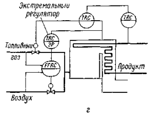 Так как зависимость температуры в топке от соотношения «топливо — воздух» имеет экстремальный характер, при автоматизации трубчатых печей применяют системы экстремального регулирования. На рис. VII-15, г экстремальный регулятор отыскивает максимальное значение температуры дымовых газов над перевальной стенкой, воздействуя на регулятор соотношения «топливный газ — воздух», управляющий подачей первичного воздуха.