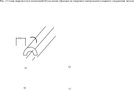 Рис. 1 Схемы вырезки (а), виды (б, в) и схемы испытаний на излом со стороны корня шва (г) и со стороны усиления шва (д) образцов из стыковых контрольных сварных соединений листов.