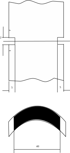 1 Контрольные сварные соединения, выполненные с применением муфт с закладными нагревателями, подвергают испытаниям на сплющивание. Испытания проводят на образцах-сегментах (рис. 5) путем сжатия концевой части образца у торца соединения до величины, равной двойной толщине стенки соединяемой трубы.