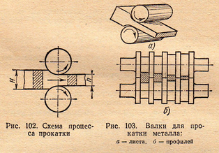 Прокатка. Операция прокатки (схема на рис.4) заключается в том, что металл обжимается между вращающимися валками прокатных станов.