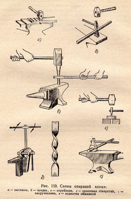 Ковка. Ковкой называют пластическую деформацию металла, при которой изменение его профиля происходит в том направлении, где металл встречает наименьшее сопротивление. Выполняют ковку последовательными ударами инструмента по обрабатываемой заготовке, лежащей на опорной площадке.