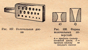 Волочение (рис.5) проволоки состоит в том, что предварительно прокатанные до 5 мм прутки большой длины протягивают через фильеры - отверстия волочильной доски, переходя последовательно от наибольшего отверстия к наименьшему. При этом проволока постепенно доводится до требуемого диаметра.
