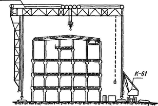 По второму варианту (рис. 2, б) монтаж осуществляется двумя козловыми кранами К-183М, поэтому здание разделено на два участка. Наиболее экономичным в работе является первый вариант.