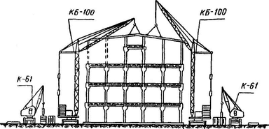 Число ведущих машин определяют из расчета своевременного выполнения полного объема работ в соответствии с графиком их производства. При этом за основу расчета принимаются эксплуатационная производительность машин и рациональные режимы их эксплуатации с учетом возможных простоев по технологическим, техническим и метеорологическим причинам. Число вспомогательных машин в комплекте определяют отдельно по каждому виду вспомогательных работ. Например, монтаж наземных конструкций корпуса промышленного предприятия может быть осуществлен следующими двумя комплектами машин. По первому варианту (рис. 2, а) монтаж конструкций осуществляется четырьмя башенными кранами марки КБ-100, для чего здание в плане разделено на четыре равновеликих участка.