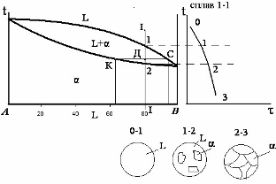 Крива ліквідус показує, як змінюється температура початку кристалізації сплавів в залежності від їх хімічного складу. Нижню криву називають кривою солідус, або кривою кінця кристалізації. Нижче неї всі сплави знаходяться у твердому стані і мають однофазну структуру твердого розчину. В інтервалі температур між кривими ліквідус і солідус, який називається інтервалом кристалізації, усі сплави складаються з двох фаз: рідини і кристалів твердого тіла. Тверді розчини прийнято позначати маленькими грецькими буквами (a, b, g, d). При цьому твердий розчин, що має кристалічну гратку компонента А позначають a, компонента В -b. Таким чином, на діаграмі стану даного типу є три різних фазових області. Для побудови кривої охолодження конкретного сплаву І-І проектують точки перетину вертикальної лінії, що характеризує склад сплаву з лініями діаграми на графік залежності температура - час (t - t) і, користуючись правилом фаз, визначають стан температури в процесі охолодження сплаву. Перша область – рідина (L), С=К–Ф+1, кількість компонентів К=2, кількість фаз Ф=1, С=2–1+1=2, оскільки система не нонваріантна, температура буде знижуватись. Друга область – твердо-рідкий стан (L+a). С=2-2+1. Так як С0, то температура також буде знижуватись, при цьому зміниться кут нахилу в зв’язку з зміною теплопровідності рідини та твердо-рідкого стану. Третя область – тверда речовина (a?), С=2–1+1=2, відбувається зниження температури. Відповідно перша область – чиста рідина, друга область – в рідині появляються тверді кристали твердого розчину a, третя область – однофазний твердий розчин a.