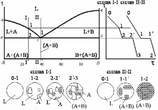 Розглянемо діаграму стану сплаву механічна суміш (рис 3). Лінія асв – лінія ліквідус, а лінія акслв – лінія солідус. Діаграми стану подібного типу при певній концентрації компонентів мають найнижчу температуру плавлення (т.с), яка називається евтектичною температурою. При цій температурі проходить евтектичне перетворення, суть якого в одночасному виділенні з рідини двох або більше типів кристалів, які мають свої типи кристалічної гратки. Кристалики дуже малих розмірів, в оптичних мікроскопах часто не розрізняються і спостерігаються як єдине зерно евтектики.