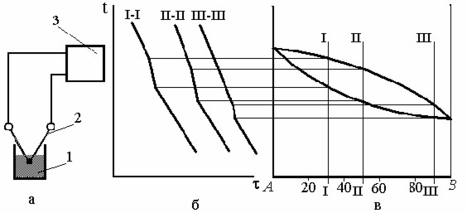 Побудова діаграм стану основана на фіксації характерних точок сплаву, що мають місце при його охолодженні (рис. 1). Для чого в сплав (1), що охолоджується поміщається термопара (2) і спеціальним приладом (3) проводиться запис температури в процесі охолодження сплаву. Аналогічний процес проводиться для декількох складів сплаву. При зміні фазового складу сплаву на кривій зниження температури, в залежності від числа ступенів свободи, буде спостерігатися перегин (рис. 4.1.б), або горизонтальна лінія. Відповідні температури, при яких проходять такі зміни наносяться на вертикальну лінію, яка на діаграмі стану показує склад нашого сплаву. Провівши подібні виміри для декількох сплавів різного складу (рис. 4.1.в) та з’єднавши відповідні точки, отримаємо діаграму стану для подвійних сплавів компонентів А і В.