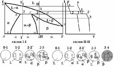 Діаграма стану обмеженого твердого розчину з перитектичним перетворенням зображена на рис 5. На цій діаграмі лінія адл – лінія ліквідус, а крива авсл – лінія солідус. При досягненні температури перитектичного перетворювання – лінія всд рідина складу т.д взаємодіє з утвореними кристалами a- твердого розчину складу т.в з утворенням кристалів b- твердого розчину (L+a=b). Таким чином, для сплавів, що знаходяться між т.к і м в результаті перитектичного перетворення, або зменшення розчинності одного компонента в іншому (криві кв та мс) кінцева структура сплаву буде складатися з механічної суміші кристалів твердих розчинів a і b. Процес перитектичного перетворення характеризується одночасним існуванням трьох фаз, що на кривих охолодження відобразиться горизонтальною ділянкою (2-2?).