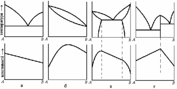 Властивості сплавів, як і тип діаграми визначаються структурами, що утворюються в процесі охолодження. Тому, очевидно, що повинен існува-ти зв’язок між типом діаграми та властивостями сплавів. Узагальнивши багаточисленні дослідження сплавів М.С. Курнаков сформулював правила, що встановлюють зв’язок між типом діаграми та властивостями, зображені на рис 8. Вверху зображені типи діаграм, а внизу залежності властивостей від концентрації компонентів.