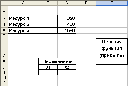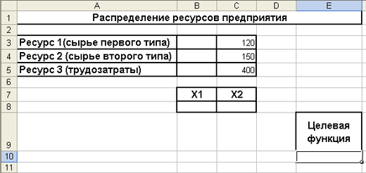 Численные значения ограничений по ресурсам внесем в ячейки C3, C4, C5. В ячейку E10 введем формулу для целевой функции