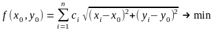 =J6*КОРЕНЬ((B10-A6)^2+(B11-B6)^2)+K6*КОРЕНЬ((B10-D6)^2+(B11-E6)^2)+L6*КОРЕНЬ((B10-G6)^2+(B11-H6)^2).