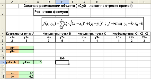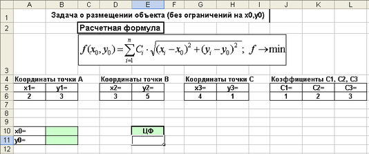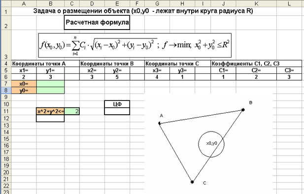 Целевая функция располагается в ячейке E11, искомые координаты объекта будут располагаться в ячейках B7, B8. В ячейку B12 введем функцию = B7^2+B8^2. Введем ограничение $B$12<=$C$11, учитывающее то обстоятельство, что объект не должен располагаться вне круга заданного радиуса. Поиск решения дает ответ