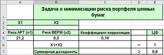 Требуется сформировать портфель минимального риска из двух видов ценных бумаг – “АРТ” с эффективностью 12% и риском 21,1 и “ВЕРМ” с эффективностью 5,1% и риском 8,3 при условии, что обеспечивается доходность портфеля не менее 8,9%. Коэффициент корреляции