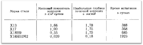 В табл. приведены экспериментальные данные по точечной коррозии хромистых и хромоникелевых сталей в морской воде. Из таблицы видно большое преимущество стали Х18Н10М2.