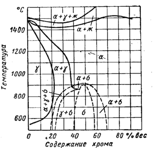 Как видно из диаграммы на рис. 2, σ-фаза появляется в системе Fe – Cr-Ni в широком интервале составов по хрому и никелю. Область образования чистой интерметаллической σ-фазы лежит приблизительно при 50 % Cr. σ-фаза обладает ограниченной растворимостью в α- и γ- твердых растворах и выделяется в хромоникелевых сталях при температурах приблизительно 900-950°С. Выделяясь в ряде случаев по границам зерен, она сообщает сплаву большую хрупкость. Присадка ферритообразующих элементов (Cr, Ti, Аl и др.) ускоряет образование σ-фазы, а присадка аустенитообразующих элементов (N, С и др.) замедляет ее выделение.