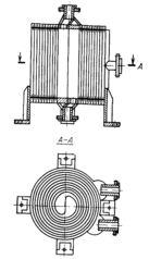 Спіральні конденсатори виготовляються лише у вертикальному варіанті і складаються з корпуса з тупиковими каналами, двох кришок (верхньої – з конусом для підведення пари до каналів та нижньої із прокладками для ущільнення каналів), чотирьох штуцерів для введення та виведення теплоносіїв, два з яких установлені на кришках, а два інших – у бокових колекторах, причому один із них, призначений для виведення конденсату, установлений у нижній частині колектора.