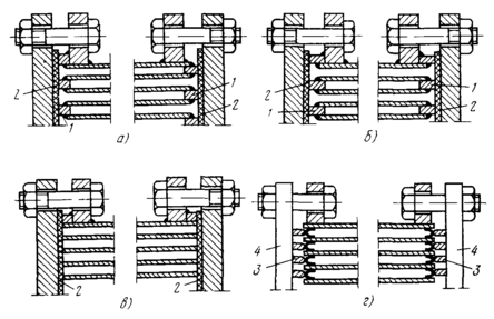 Рисунок 2 – Ущільнення торців каналів: а – тупикові; б – сліпі; в – наскрізні, ущільнені листовою прокладкою; г – наскрізні, ущільнені U-подібною прокладкою